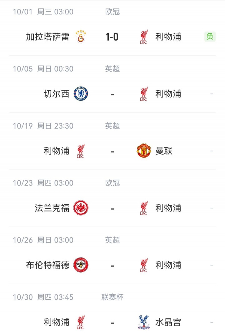 10月01日訊 凌晨歐冠聯賽階段第二輪,利物浦0-1不敵加拉塔薩雷。在上周末輸給水晶宮后,利物浦遭遇了兩連敗。在此之前利物浦一度取得開季7連勝,在英超積分榜上甚至5分領跑,但近兩場比賽利物浦暴露出了各種問題。本周末,利物浦將在聯賽中對陣切爾西,后者聯賽遭遇兩連敗。之后進入國際比賽日,10月下半月,利物浦又將連戰曼聯、法蘭克福、布倫特福德和水晶宮。